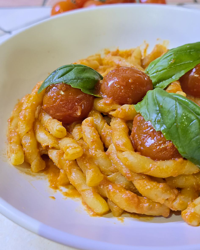 In questa preparazione, il Fusillo Napoletano agisce come uno scrigno: le sue spire accolgono la cremina vellutata che si sprigiona dalla mantecatura, creando un equilibrio perfetto tra la sapidità del formaggio e l’acidità nobile del pomodoro maturato al sole.