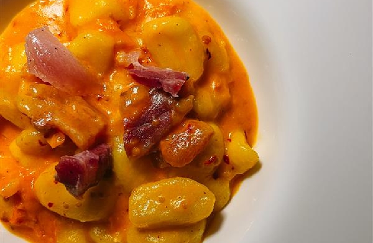 Ma il vero protagonista è un'altra specialità calabrese: la 'nduja. Aggiunta al condimento, si scioglie, creando una crema omogenea e piccante che avvolge ogni gnocco, un tocco di fuoco che richiama il carattere vivace e solare della gente del posto. La 'nduja non è solo piccante, è un'esplosione di gusto che racconta la storia di una terra generosa e fiera.